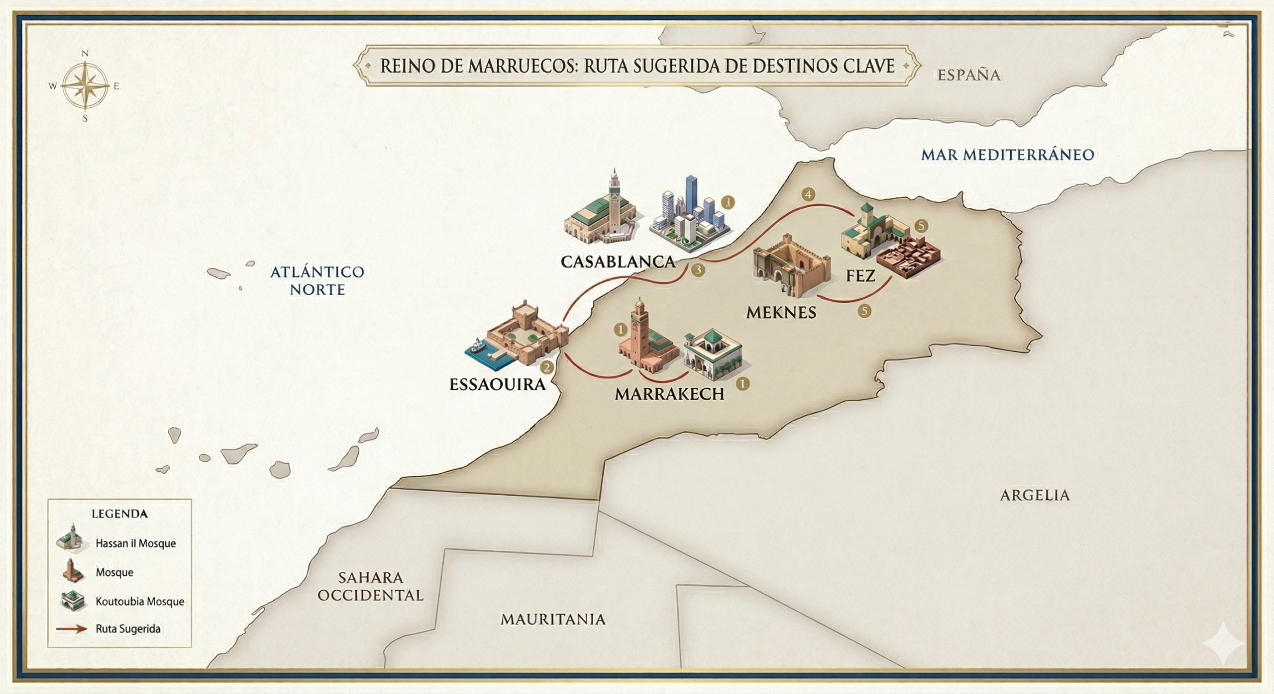 En Marruecos, la cultura está profundamente arraigada en el Islam, lo que exige una vestimenta modesta que cubra hombros y rodillas tanto para hombres como para mujeres en todas las ciudades; mientras que en Casablanca y Marrakech se percibe un ambiente más cosmopolita y flexible, en las laberínticas medinas de Fez y Meknes el conservadurismo es mayor y es fundamental pedir permiso antes de fotografiar personas o puestos locales. En la costera Essaouira, el estilo es más bohemio y relajado debido a la influencia de los vientos alisios, pero en todas estas ciudades el acceso a las mezquitas está prohibido para no musulmanes (salvo la Gran Mezquita Hassan II en Casablanca). Socialmente, la hospitalidad se sella con el té de menta, el cual es de mala educación rechazar, y se debe utilizar siempre la mano derecha para comer o saludar, manteniendo una actitud paciente ante el regateo, que es un ritual cultural esencial en los zocos.
