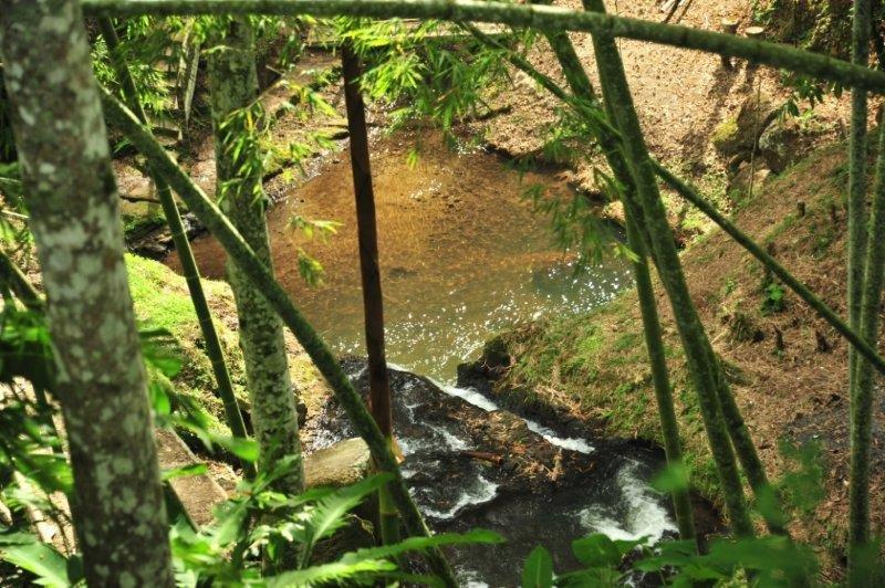 2. Zona de Baño Natural: Acceso a la caída de agua cristalina rodeada de paredes de roca y guaduales, perfecta para un baño refrescante.