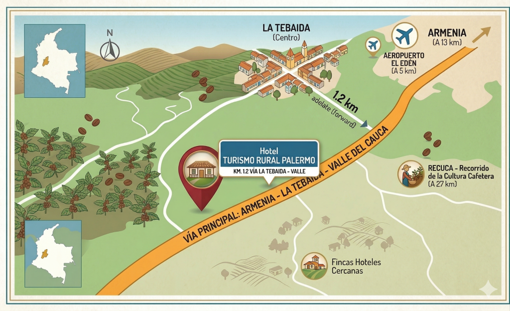 Turismo Rural Palermo se posiciona como un refugio estratégico en el Eje Cafetero, específicamente a un kilómetro de La Tebaida, sobre la vía que conecta con el Valle del Cauca. Su ubicación es privilegiada para quienes llegan por aire, ya que se encuentra a solo 5 minutos del Aeropuerto El Edén de Armenia. Además, destaca por su facilidad de acceso gracias a la amplia oferta de transporte público que circula por la zona.