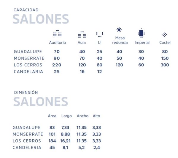Para cualquier conferencia o reunión, este hotel en Bogotá ofrece amplias salas de reuniones, un Centro de Negocios e internet gratuito. La capacidad de los salones, es la siguiente: