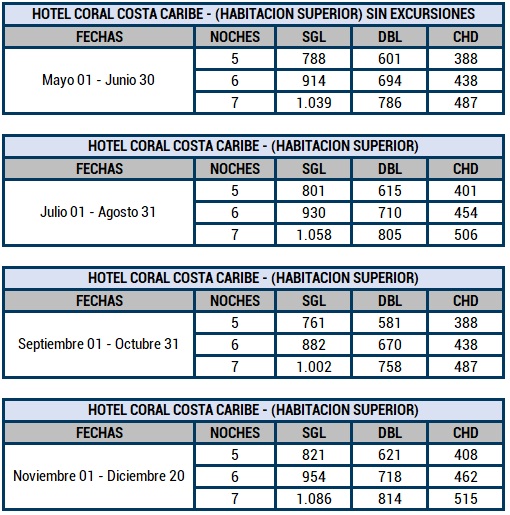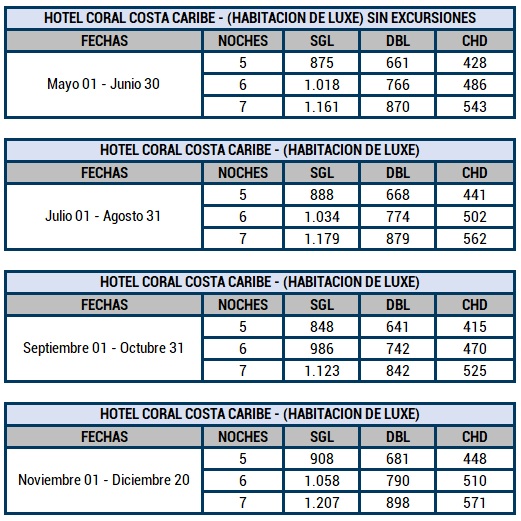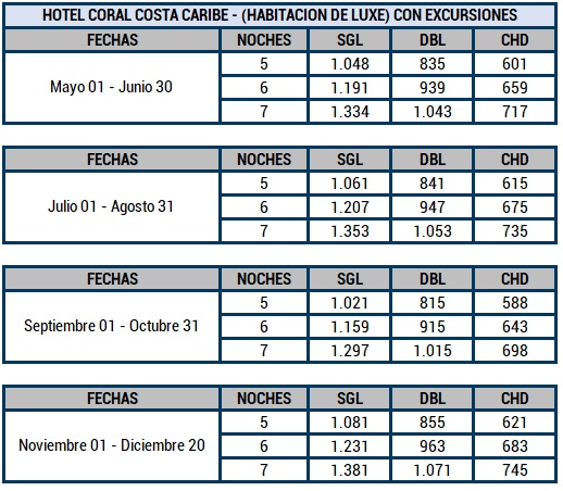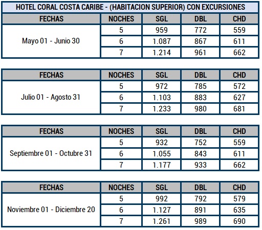 NOTA: Las excursiones corresponden a Isla Saona Premium y City Tour por Santo Domingo. La edad de los niños de 4 a 12 años en cuanto al alojamiento y de 3 a 10 años para excursiones. Planes desde 5 y hasta 7 noches. Tarifas sujetas a cambios y disponibilidad sin previo aviso