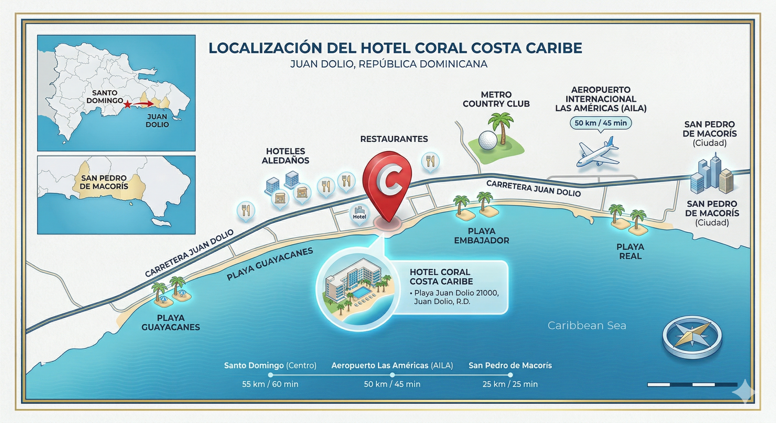 Estas son solamente algunas de las cosas que puede disfrutar cuando se hospeda con nosotros en Coral Costa Caribe.La cálidez de su personal se transmite a través de cada detalle. Siéntase abrazado por su frondosa vegetación, revestido por intachables jardines de flores y árboles tropicales, y tome refugio en cómodas habitaciones que reflejan el encanto del destino en su decoración. Inmerso en un entorno de entretenimiento y frente a las cálidas aguas del Mar Caribe, se ubica el Coral Costa Caribe, brindándole al huesped una insuperable oferta todo incluido. Su cercanía a la ciudad de Santo Domingo lo confiere como el destino idóneo para una escapada espontánea, disfrutar de un asueto durante un fin de semana largo o si no desea desplazarse muy lejos de la ciudad. A tan solo 30 minutos del Aeropuerto Las Américas, 50 minutos del Aeropuerto La Romana, 60 minutos de la Zona Colonial, 90 minutos del Aeropuerto Punta Cana.