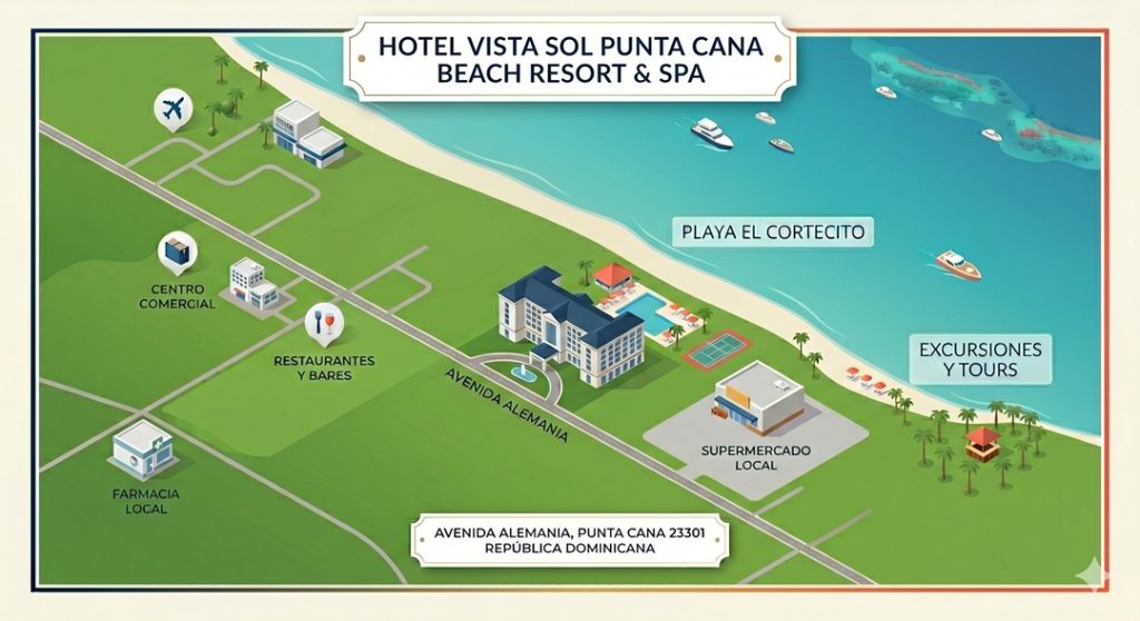 Se encuentra en la Avenida Alemania, Punta Cana 23301, República Dominicana. Su ubicación es privilegiada, ya que está situado directamente sobre la famosa Playa El Cortecito en la zona de Bávaro. Esta área es conocida por ser una de las más vibrantes, con acceso cercano a tiendas locales y restaurantes fuera del complejo. VER VIDEO