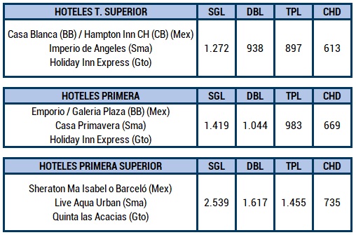 NOTA: Tarifas sujetas a cambios y disponibilidad, sin previo aviso. Los Hoteles pueden canmbiar pero manteniendo la categoria.