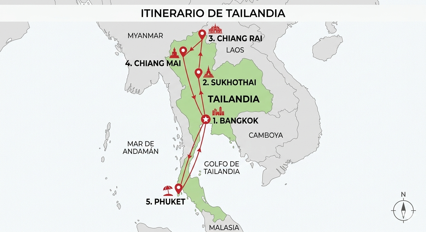 Bangkok, Sukhothai, Chiang Rai, Chiang Mai y Phuket